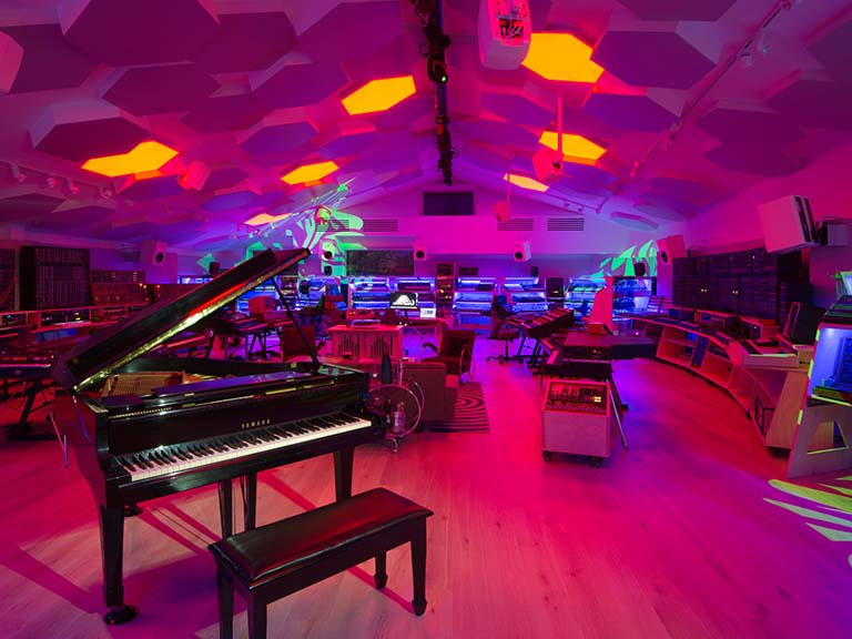 Studio 1 is designed for immediate creativity. An artist can literally turn up and start writing and recording with virtually zero setup time. All the synthesizers (~120) and outboard effects (~50) are turned on, connected and ready to play in custom ergonomic stands. This makes writing and recording alone or in groups a breeze, as artists and producers can play and record any of the keyboards together through any (or all) of the outboard effects and 30 Genelec speakers and subs with near zero latency. The opportunity for exploration is extraordinary.