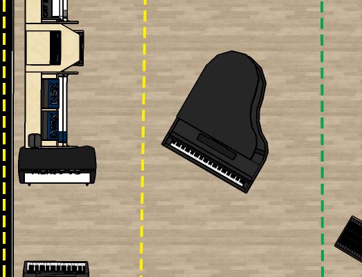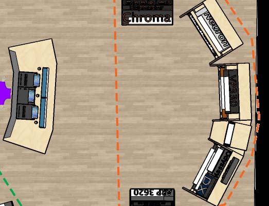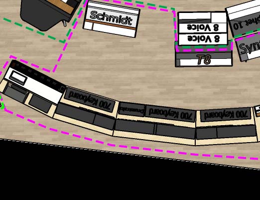 Studio 1 is also incredibly versatile. At 195 square metres, and with 4.5 metre ceilings at the apex, it is also a large live room which can house an ensemble or large band, with everthing cabled into Studio 2 for control room duties. And in fact the layout allows for 40 or more keyboard players to rehearse and record simultaneously as a “Synth Orchestra”.